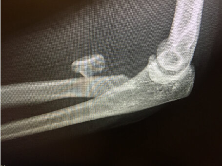 This is an unusual case of an elbow fracture/dislocation with an extruded radial head and an intact proximal ulna.