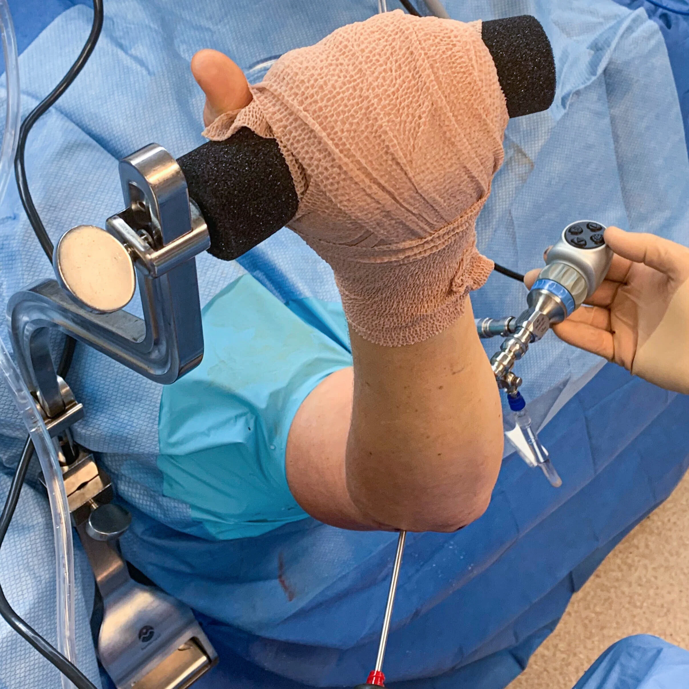 The ElbowLOC® Supine Suspended Positioner Assembly provides a highly functional platform for supine suspended elbow arthroscopy. The surgeon directly controls the elbow position and since everything’s sterile, conversion to open procedures is straightforward.